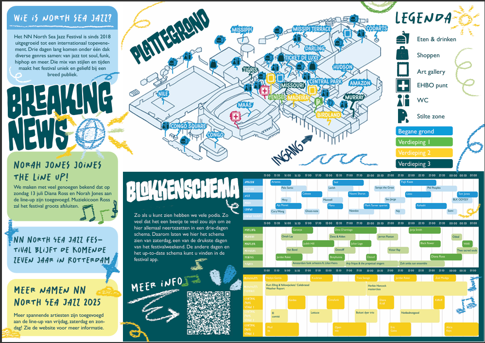 In februari ’25 kreeg ik de opdracht om een nieuwe identiteit te creëren voor het North sea jazz festival (officieel het NNNrth sea jazz festival). Deze identiteit moest natuurlijk ook tot leven komen. Dat kon gebeuren door middel van verschillende media-uitingen. Daarom was ook de opdracht om verschillende media-uitingen te maken. De keuze is uiteindelijk gemaakt voor het maken van een flyer, een app en een promotie video.