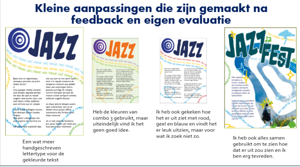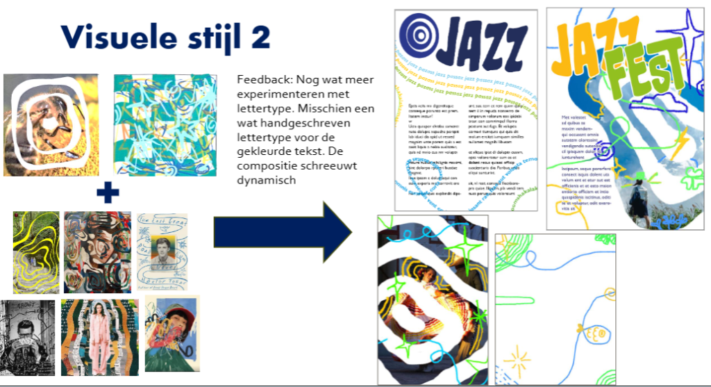 Om de uiteindelijke stijl te vinden, moest ik eerst onderzoek doen naar het festival zelf en de sfeer daarvan. Uit dat onderzoek is gebleken dat de merkwaarde Dynamisch er het beste bij past. Het festival evolueert zich steeds met de tijd en de muziek/vibe is ook heel energiek. De kleuren die ik heb gekozen (blauw, groen, geel) staan voor de omgeving en het gevoel wat het festival geeft. De typografie is schreefloos sinds typografie met schreef voornamelijk een chic en duur gevoel geeft terwijl jazz juist erg toegankelijk is. Ook is het lettertype wat ik heb gekozen voor de koppen erg los, net als jazz.