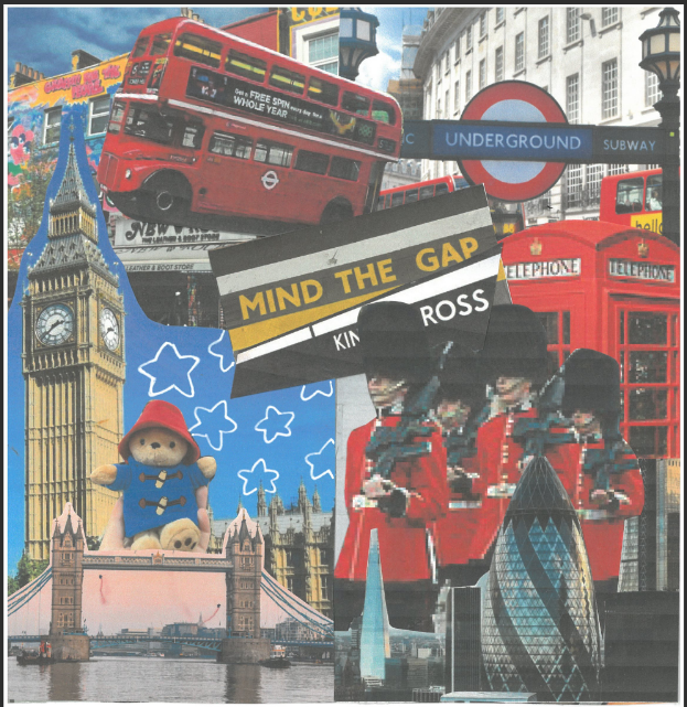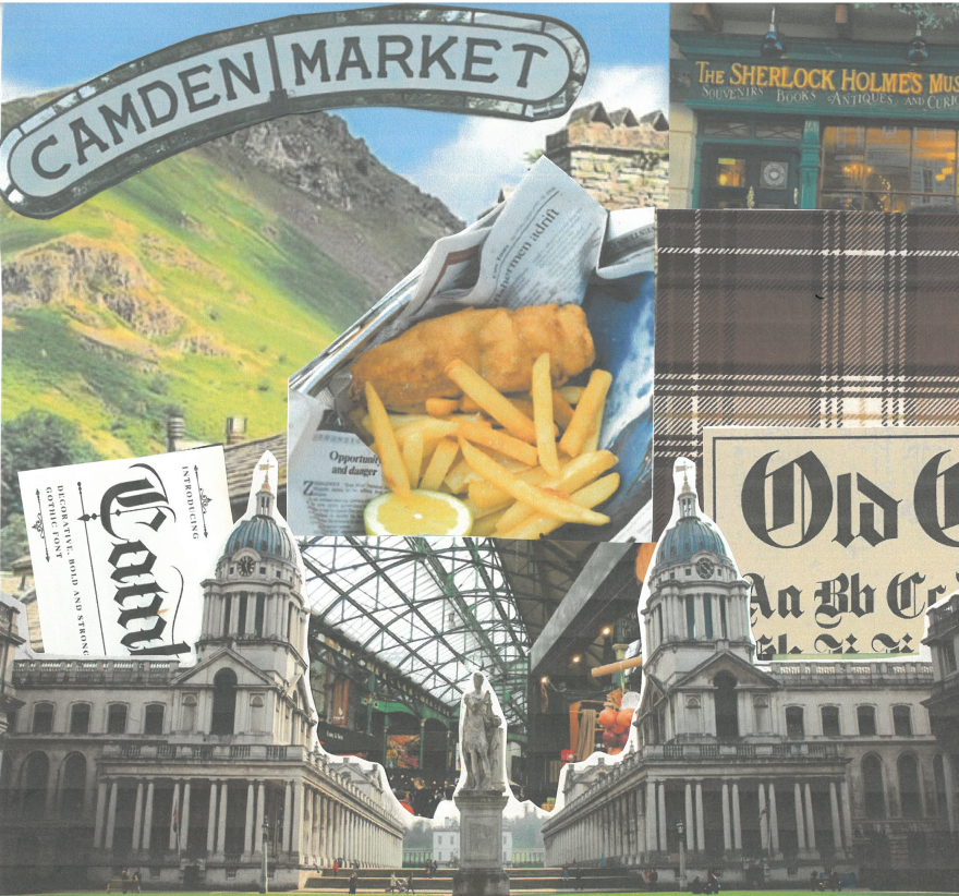 Na veder te hebben ge-experimenteert, ben ik uit eindelijk gekomen op deze stijl (collage 1). De kleuren zijn afkomstig van de Engelse vlag en van de iconische rode dubbel decker. Ook ging ik voor een complementair contrast zodat het rood er erg goed uit zou springen.