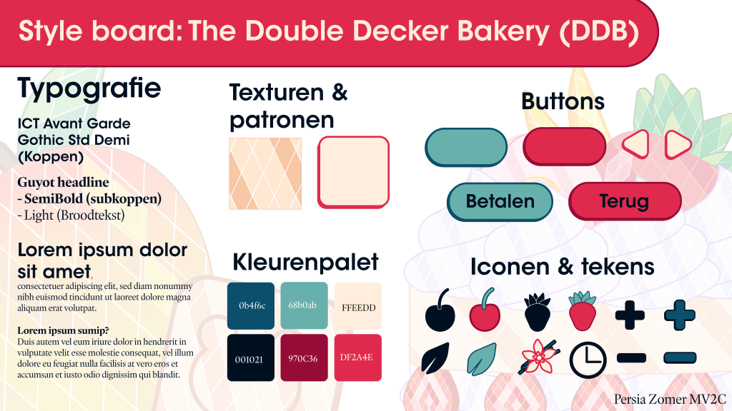 Als eerste heb ik mijn onderzoek gedaan naar welk product (taart) en de plek waar het vandaan komt (Engeland). Vervolgens ben ik gaan experimenteren met verschillende kleuren, technieken en motieven om zo te komen bij een stijl. De stijl die ik heb gekozen voor mijn ingrediënten is gebaseerd op het gebouw de Gherkin. Die staat ongeveer in centraal London.